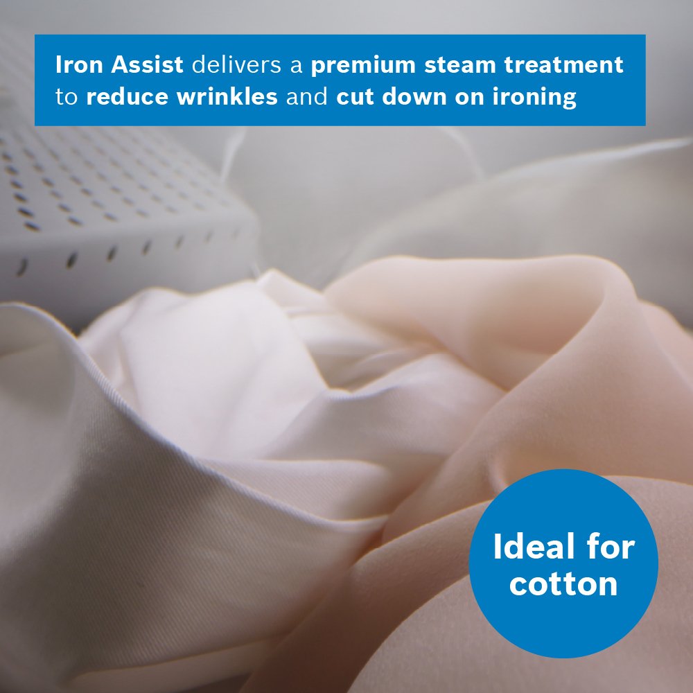 Hate ironing? Iron Assist gently steams clothes to reduce wrinkles, making ironing faster and easier. This feature also refreshes worn clothes, so you can spend less time pressing and more time wearing.