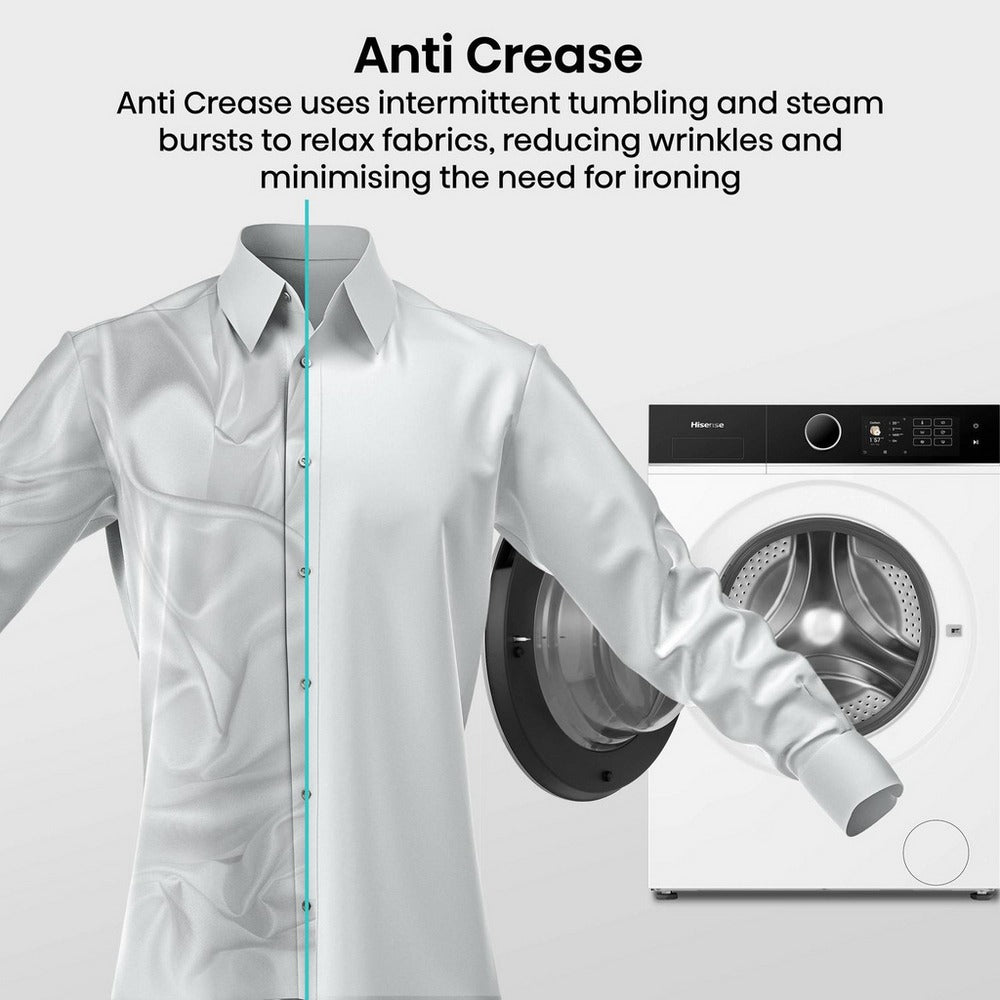 Combining space-saving design, time-efficient programmes, and energy-conscious technology, the Hisense WF5I9043BWFS washing machine offers a practical and modern solution for households seeking powerful cleaning performance in a compact, efficient appliance.