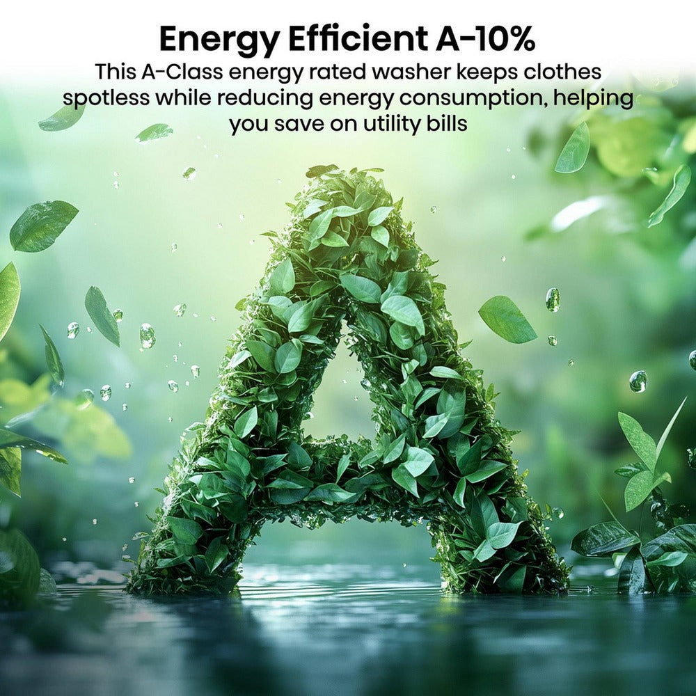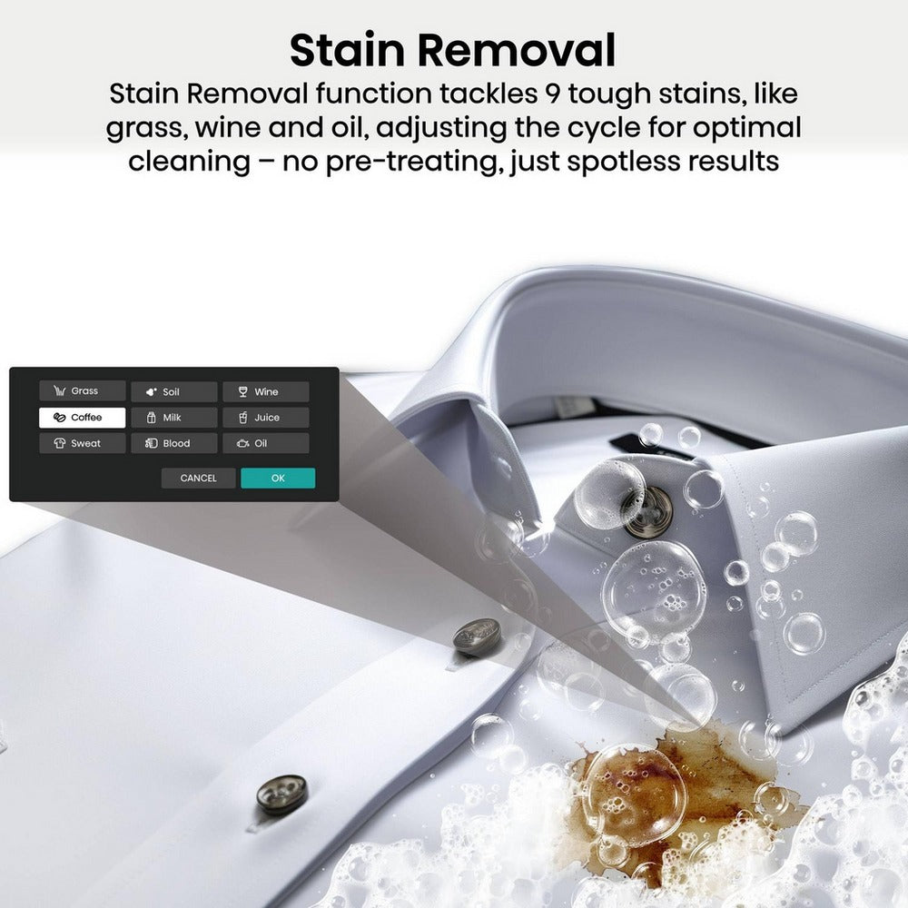 Designed for busy households, this washing machine includes intelligent time-saving and energy-efficient features. Quick Wash Pro provides tailored cycles for different load sizes — complete a full wash in under an hour or refresh smaller loads in just 15 minutes. The Cold Wash function reduces energy consumption by up to 71% by using lower temperatures with extended cycle times, while the Stain Removal feature automatically adjusts wash settings to target nine common stains for enhanced cleaning results with minimal effort.