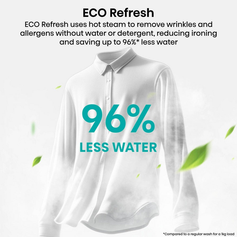 ECO Refresh - Refresh your clothes the smart way with ECO Refresh. This innovative feature releases a powerful burst of hot steam into the drum, penetrating deep into fabric fibres to remove wrinkles and allergens – all without using water or detergent. Perfect for freshening up dry clothes, ECO Refresh reduces the need for ironing, saving you time and effort, while also using up to 96% less water compared to a regular wash for a 1kg load. Effortless, eco-friendly and incredibly effective. |
